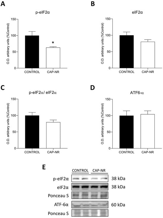 UPR pathway markers in the brain of control and CAP-NR-treated mice. Representative immunoblots and quantification of (A) p-eIF2α, (B) eIF2α, (C) p-eIF2/eIF2 and (D) ATF-6α; (E) quantification. * p ≤ 0.05. Data are represented as mean and standard error of the mean (SEM).