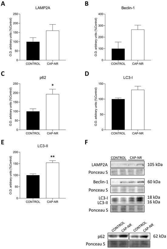 Immunoblots comparing protein expression levels of LAMP2A (Figure 6A) and Beclin-1 (Figure 6B) showed non-significant differences between brain lysates from CAP-NR-treated animals and those from control animals. Nonetheless, the expression levels of p62 were significantly increased in CAP-NR-treated animals (p < 0.05) (Figure 6C), as well as those of LC3-II (p < 0.01) (Figure 6E), while LC3-I levels presented non-significant differences (Figure 6D). This increased expression of macroautophagy markers indicates a potential neuroprotective effect reducing the levels of damaged and aggregated proteins as an adaptive cellular process aimed at preserving protein stability.