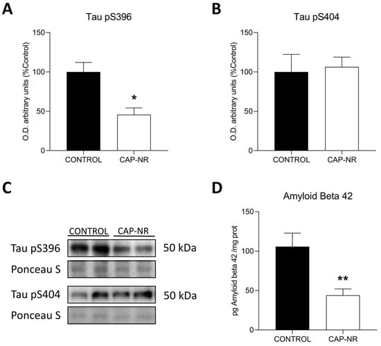 Expression of neurodegenerative markers in the brain of control and CAP-NR-treated mice. Representative immunoblots and quantification of (A) Tau pS396 and (B) Tau pS404; (C) quantification; (D) expression of Aβ42 measured as pg/mg total protein. * p ≤ 0.05, ** p ≤ 0.01. Data are represented as mean and standard error of the mean (SEM).