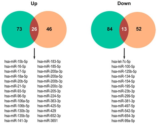CC | let-5p, miR-9-5p, miR-10a-5p, miR-15b, miR-16-5p, miR-20, miR-21-5p, miR-25-5p, miR-27a, miR-29, miR-30, miR-31, miR-92b, miR-92a-3p, miR-93, miR-96, miR-106a, miR-125b, miR-127, miR-133a/b, miR-135b, miR-141a/b, miR-142, miR-146, miR-150, miR-155, miR-181, miR-182, miR-185, miR-189, miR-193a-3p, miR-196a, miR-199a/b, miR-203a/b, miR-205, miR-210, miR-215, miR-221, miR-222, miR-223, miR-224, miR-301b, miR-320, miR-361, miR-373, mi-R378, miR-425, miR-449, miR-451a, miR-466, miR-486-5p miR-494, miR-500, miR-505, miR-519d, miR-543, miR-590-5p, miR-711, miR-720, miR-886-5p, miR-888, miR-892b, miR-944, miR-1246, miR-1285, miR-1290, miR-2392, miR-3147, miR-3162, miR-4484, miR-6852 | let-7a/b/c/g, miR-1, miR-7; miR-10b, miR-17-5p, miR-22, miR-23b, miR-24, miR-26a, miR-27b, miR-29a/b, miR-30a/e, miR-99a/b, miR-100-5p, miR-101, miR-103b, miR-107, miR-124-3p, miR-125a/b, miR-126-3p, miR-129b-5p, miR-132, miR-133a, miR-138, miR-139-3p, miR-140-5p, miR-141, miR-142-3p, miR-143, miR-144, miR-145, miR-149, miR-152, miR-154, miR-181, miR-182, miR-183, miR-186, miR-187, miR-193a/b, miR-195, miR-196b-5p, miR-199a/b, miR-202, miR-203, miR-204, miR-205, miR-211, miR-212, miR-214, miR-216-5p, miR-218, miR-223, miR-296, miR-320; miR-326, miR-328, miR-329, miR-331-3p, miR-335, miR-337, miR-338-3p, miR-342, miR-362, miR-374c-5p, miR-375, miR-376a/c, miR-379, miR-383, miR-424, miR-429, miR-451, miR-484, miR-486-3p miR-489-3p, miR-491-5p, miR-494, miR-497, miR-503, miR-506, miR-544, miR-630, miR-634, miR-638, miR-720, miR-758, miR-892b, miR-1297, miR-1246, miR-2861, miR-3156-3p, miR-3185, miR-3666, miR-3960, miR-4262, miR-4467, miR-4488, miR-4525 | [227,228,238,240,241,242] |