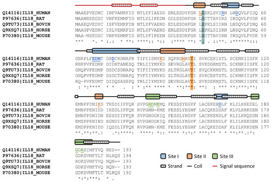 Mammalian IL-18 protein sequence alignment. Human, rat, bovine, horse, and mouse IL-18 protein sequences were obtained from the Uniprot database. The residues highlighted in cyan represent glutamic acid at the 42nd and 6th residues of full human IL-18 and mature human IL-18, respectively. The residues highlighted in orange are threonine residues, specifically the 99th residue in the full sequence and the 63rd in the mature sequence. The signal and mature sequences are represented by the red and black lines, respectively. The color boxes for the binding regions were based on the mature sequence, which included binding sites I, II, and III. Each binding site’s bold and underlined amino acids are human IL-18 receptor-interacting residues. The fully conserved, strongly similar, and weakly similar residues are labeled by asterisks (*), colons (:), and periods (.), respectively.