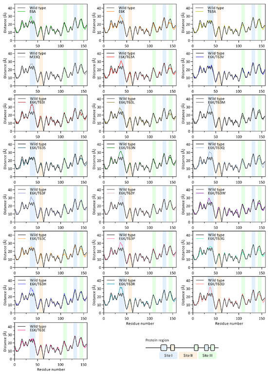 We investigated the overall structural change using the center of geometry study. The distance pattern between the 63rd and other residues was used to represent the regions of conformational change (Figure 2). For E6K/T63A, the large different region was located in the large loop of binding site I (Glu31-Thr45), while binding site III loops (Gly108-Lys112 and Asp142-Met150) exhibited minor structural changes (Figure 2). Binding site II region (Lys53-Met60) remained similar across all mutant structures.