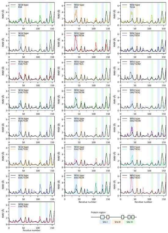 The root-mean square fluctuation (RMSF) was used to determine the binding loop flexibility. The results showed that the coupled mutation affected the flexibilities at binding sites I and III. The large binding site I (Glu31-Thr45) of E6K/T63A exhibited higher flexibility than the wild type, whereas the small binding site I (Glu130-Phe134) loop was lower than the wild type (Figure 3). Similarly, binding site III flexibilities of E6K/T63A showed that the RMSF values of the Gly108-Lys112 loop increased while the flexibility of the Asp142-Met150 loop decreased to lower than the wild type.