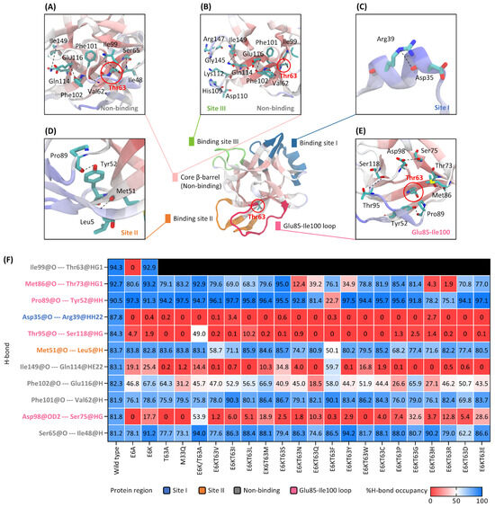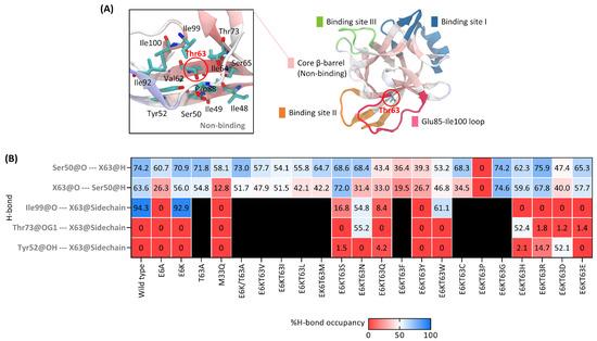 Figure 5 shows the structural insight and direct H-bonds of the 63rd residue and neighbors. Thr63 at the non-binding region was surrounded by hydrophobic residues (Ile48, Ile49, Tyr52, Val62, Ile64, Pro88, Ile92, Ile99, and Ile100) and hydrophilic residues (Ser50, Ser65, and Thr73) (Figure 5A). This region was hydrophobic with a wild type hydrophobicity index of 9.28. The wild type backbone atoms of Thr63 and Ser50 bonded between two β-sheets, Ser50@O-Thr63@H (74.2% occupancy) and Thr63@O-Ser50@H (63.6% occupancy) (Figure 5B). These bonds had fluctuating occupancies from the Thr63 alteration in many mutants, which may affect sheet stabilization. These stabilized bond occupancies were reduced to less than 50% in some large-residue substitutions, including E6K/T63Q, E6K/T63F, E6K/T63Y, E6K/T63P, and E6K/T63D, suggesting that the backbone of the 63rd residue-involved H-bonds was able to loosen the core structure through local H-bond relaxation.