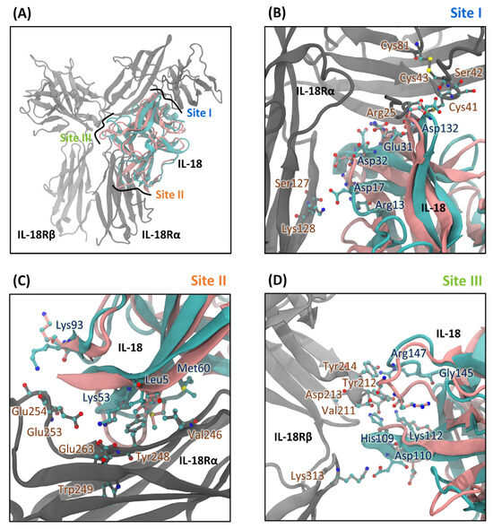 Structural insight of IL-18/IL-18Rα/IL-18Rβ signaling complex. (A) Ternary complex of wild type IL-18 and IL-18 receptors. The simulated IL-18 (salmon) and the crystal structure of IL-18 (cyan) from 3WO4 were superimposed. The binding sites of IL-18 to IL-18Rα (dark gray) and IL-18Rβ (light gray), including binding sites I, II, and III, were illustrated. The binding residues were aimed at the binding pockets containing the apo form of simulated IL-18, which bent the binding side chains in various directions. This was particularly true of Asp32 of binding site I (B), Lys93 of binding site II (C), and Asp110/Arg147 of binding site III (D).