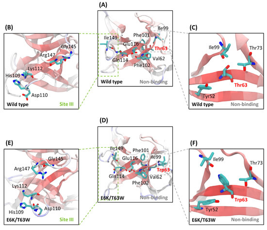 The effects of the 63rd residue cavity modification. Changes in the wild type and E6K/T63W structures were explored at the non-binding region (A,D), binding site III (B,E), and the 63rd residue cavity (C,F). Binding site III and the 63rd residue region were linked by Val62, Phe101, Phe102, Glu116, Gln114, and Ile149, which involved conventional H-bonds of the non-binding region. While binding site III loops of E6K/T63W were shifted from wild type, the 63rd residue cavity of E6K/T63W (Trp63/Thr73/Ile99) was larger than the wild type (Thr63/Thr73/Ile99).