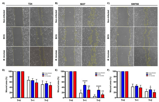 To carry out the wound-healing assay, T24, 5637, and SW780 BC cells were seeded into 24-well cell culture plates (Nunclon, Roskilde, Denmark) at 2 × 105 cells/well or 3 × 105 cells/well for SW780 in CM. After reaching a confluence monolayer, cells were infected at MOI 10 with BCG or M. brumae or left untreated. After 3 h of incubation, an artificial wound was created using a sterile 10 µL pipette tip, and cells were washed five times with PBS. CM without FBS for T24 and 5637 cells or CM with 1% of FBS for SW780 cell line was added to evaluate cell migration. These optimized conditions using serum starvation were considered the gold standard for comparison purposes. Previous studies in our laboratory showed that the addition of mitomycin C before mycobacteria infection has a synergic effect in growth inhibition rates, which could alter the interpretation of the true migration of mycobacteria-treated cultures. The plates were incubated at 37 °C with 5% CO2, monitored, and photographed using an inverted microscopy Axio Observer A1 (Zeiss, Oberkochen, Germany) at different time points: 0, 12, and 24 h. The wound-healing area was calculated as the percentage area of the initial wound with respect to the percentage area of wound closure at 24 h using the ImageJ ver.2.0.0 software and the MRI Wound Healing Tool macro (http://dev.mri.cnrs.fr/projects/imagej-macros/wiki/Wound_Healing_Tool (accessed on 1 October 2022)) [57,58,59].