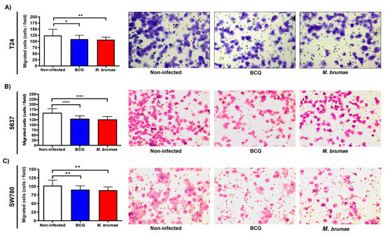 Migration and invasion assays were performed using transwell inserts (8 µm pore size) (Falcon, Schaumburg, IL, USA) as described previously with slight modifications [60,61]. Briefly, T24, 5637, and SW780 cells, with a previous starving of 24 h, were seeded into 24-well cell culture plate (Nunclon, Denmark) at 2 × 105 cells/mL in CM without antibiotics. After 3 h of incubation, cells were infected with BCG or M. brumae (MOI 10:1) as mentioned above. Three hours later, the cells were washed five times with warm PBS and detached with 0.2 mL of trypsin (Biowest, Nuaillé, France). The treated cells were collected by centrifugation at 250× g for 10 min, and the pellets were resuspended in DMEM-F12 medium. For the migration assay, 1.5 × 104 cells (for T24 and 5637) or 3 × 104 cells (for SW780 BC cells) in 0.2 mL of CM without FBS were added into the transwell inserts. To perform the invasion assay, 3 × 104 mycobacteria-infected T24 and 5637 cells in 0.2 mL of CM without FBS were seeded in transwell inserts precoated with 3 mg/mL of Matrigel (Corning, New York, NY, USA). Then, 0.8 mL of CM was added into the wells of 24-well cell culture plates (Falcon, USA) as chemoattractant media. After 24h of incubation, migrated cells were fixed with methanol solution and stained with 0.2% crystal violet (Sigma Aldrich, St. Louis, MO, USA). Five random different fields of each stained transwell inserts were photographed under a microscope (Nikon Eclipse TE-2000·E, Tokyo, Japan) and counted using the ImageJ ver.2.0.0 software.