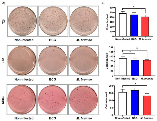 To study the anchorage-independent growth of non-infected and mycobacteria-infected cells, human intermediate-grade (5637) and high-grade (T24 and J82) cells were initially selected. Experiments with intermediate-grade 5637 cells showed no colony formation in either infected or non-infected conditions, as expected. Thus, to increase the number of studied cell lines, the murine high-grade MB49 cell line was included. The MB49 cell line is extensively used to study the murine orthotopic model of the disease. As shown in Figure 3A,B, M. brumae infection significantly reduced anchorage-independent growth (colony formation) in all BC cell lines, with reductions of 15.5%, 12.3%, and 17.5% for T24, J82, and MB49 cells, respectively, compared to non-infected cells. In contrast, BCG treatment only produced statistically significant differences in the J82 cell line, where a 12.1% reduction in colony formation was observed (Figure 3 and Supplementary File).