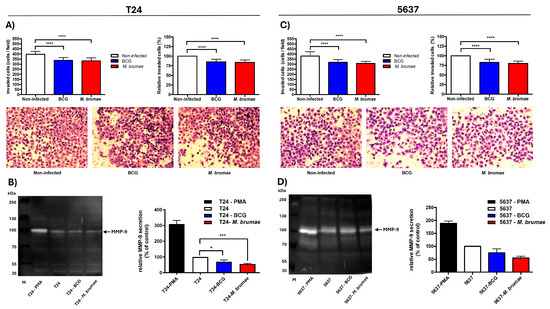 When transwell cell invasion assay was performed, a strong statistical reduction in cell counts was found in mycobacteria-infected compared to non-infected BC cells (Figure 4). Both T24 and 5637 cell lines showed a similar response to each mycobacterial treatment. BCG treatment reduced invasion by 14.9% in T24 cells and 17.2% in 5637 cells, while M. brumae treatment reduced invasion by 16.2% and 19.6%, respectively (Figure 4A,C and Supplementary File).