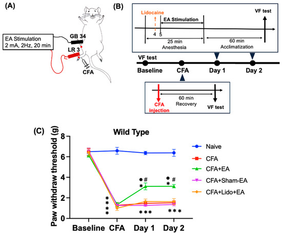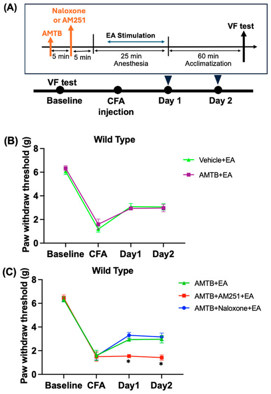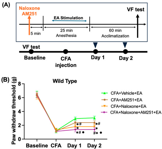 2.2. Naloxone and AM251 Effectively Reversed the Analgesic Effect of EA in CFA-Induced Inflammatory Pain in Wild-Type Mice