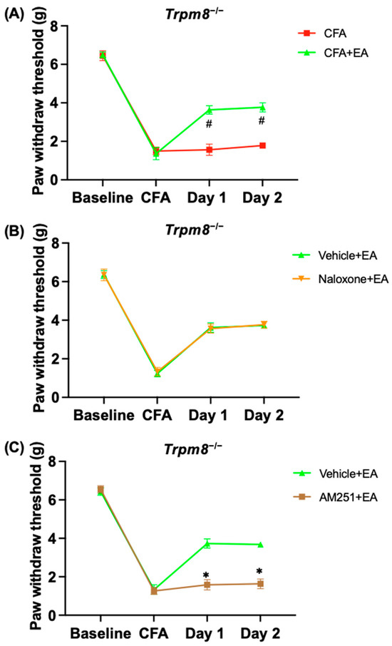 2.4. The Effect of EA on the Pretreatment of CB1 Receptor Antagonist (AM251) or the Opioid Receptor Antagonist (Naloxone) in CFA-Induced Inflammatory Trpm8−/− Mice
