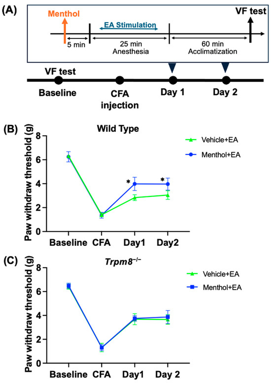 2.5. Menthol Increased the Analgesic Effect of EA in CFA-Induced Inflammatory Pain in Wild-Type Mice but Not Trpm8−/− Mice