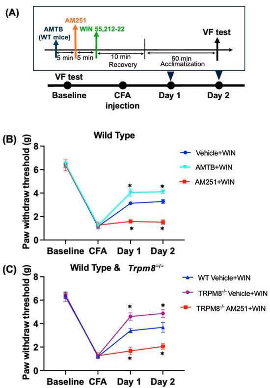 2.6. Cannabinoid Receptor Type 1 (CB1 Receptor) Agonist, WIN 55,212-2, Induced the Analgesic Effect in Inflammatory Pain in Both Wild-Type Mice and Trpm8−/− Mice