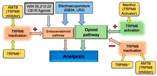 - Liu, B.; Fan, L.; Balakrishna, S.; Sui, A.; Morris, J.B.; Jordt, S.E. TRPM8 is the principal mediator of menthol-induced analgesia of acute and inflammatory pain. Pain 2013, 154, 2169–2177. [Google Scholar] [CrossRef] [PubMed]
