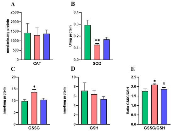 Liver was homogenized in phosphate buffer 50 mM and EDTA 0.1 M, pH 8. Then, 10 µL of HClO4 were added per mL of homogenate, and supernatants were used for the quantification of both reduced (GSH) and oxidized (GSSG) glutathione by o-phthalaldehyde (OPT) at pH 12 and pH 8, respectively, resulting in the formation of a fluorescent compound. Fluorescence was measured at 350 nm excitation and 420 nm emission []. Results were expressed as nmol of GSSH and GSH per mg of protein. Moreover, the GSSG/GSH ratio was calculated for each sample.