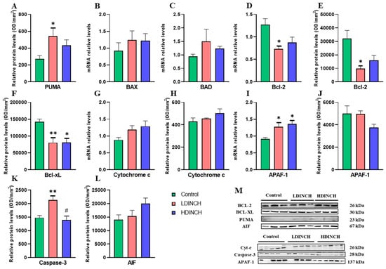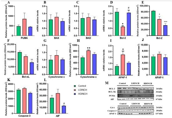 Effects of DINCH Exposure on Apoptotic Markers in the Liver of PND6 Offspring. Protein levels of PUMA (A), mRNA expression of BAX (B), BAD (C), and Bcl-2 (D), protein levels of Bcl-2 (E) and Bcl-xL (F), mRNA expression and protein levels of Cytochrome c (G,H), and APAF-1 (I,J), and protein levels of Caspase-3 (K) and AIF (L). Representative images of the Western blot results (normalized using stain-free gels) for the different proteins studied (M). Data represent mean ± SEM. * p < 0.05 vs. control, ** p < 0.01 vs. control, *** p < 0.001 vs. control. # p < 0.05 between treated groups. Three groups are shown: control (in green), LDINCH (in red) and HDINCH (in blue).