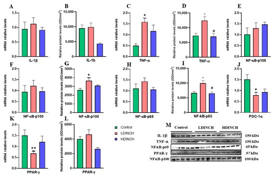 Effects of DINCH exposure on inflammatory response in the liver of PND6 offspring. mRNA expression and protein levels of IL-1β (A,B), TNF-α (C,D), NF-κB-p100 (F,G), NF-κB-p65 (H,I), and PPAR-γ (K,L), and protein levels of NF-κB-p105 (E) and PGC-1α (J). Representative images of the Western blot results (normalized using stain-free gels) for the different proteins studied (M). Data represent mean ± SEM. * p < 0.05 vs. control, ** p < 0.01 vs. control. # p < 0.05 between treated groups. Three groups are shown: control (in green), LDINCH (in red) and HDINCH (in blue).