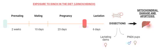 The aim of this work was to evaluate whether DINCH oral administration at two different doses to Long-Evans lactating rats during pregnancy could induce liver alterations by increasing inflammation, inducing oxidative stress, and triggering apoptosis. Moreover, it was studied whether this effect could also be observed in the offspring at post-natal day 6 (PND6).
