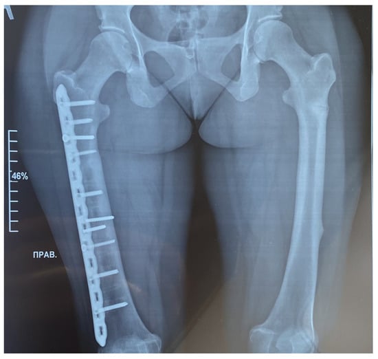 All the fractures were caused by low-energy trauma. At the age of 30, she experienced a closed fracture of the middle third of the left tibia. Surgical treatment was performed: open reposition with correction of the deformity and metal osteosynthesis of the tibia. At the age of 32, she experienced a closed transverse fracture of the middle third of the right femur with displacement of fragments. Surgical treatment was performed using open reposition and osteosynthesis of the femoral fracture with a plate. At the age of 37, she experienced a refracture at the exact same location as the previous one with displacement of fragments. She was treated surgically by open reduction and internal fixation with a ten-hole plate and screws (Figure 1).