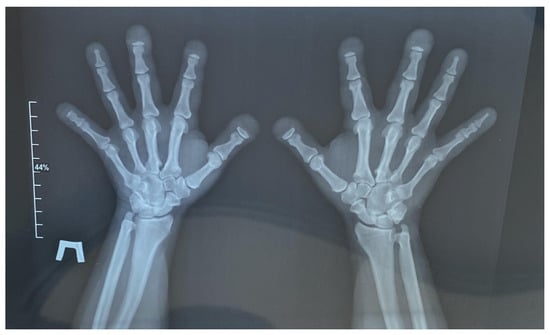 The patient presented with typical craniofacial dysmorphisms, short stature, and increased bone density. Physical examination affirmed a 150 cm stature, frontal bossing, blue sclera, narrow palate, oligodontia, anomaly of the shape and position of the teeth, four missing lower incisors and one missing lower premolar, and a retrognathic mandible. Hypo-plastic nails and osteolytic defects of the distal phalanges of the hand were also noted. Hand radiographs showed partial dysplasia of the distal phalanx, clinically evident as malformed and dysmorphic fingers (Figure 2).