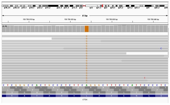Whole exome sequencing of the patient’s DNA revealed the chr1:150799624A>G (NM_000396.4:c.704T>C (p.Leu235Pro)) variant in the CTSK gene in the homozygous state (Figure 4). This variant has not been previously described. This nucleotide sequence variant has not been registered in the gnomAD database. The variant is located in a highly conserved position. In silico algorithms predict the pathogenic effect of the variant on the protein. Therefore, according to the ACMG criteria, this variant of the nucleotide sequence variant is regarded as likely pathogenic (PP3, PM2, PP2).