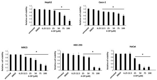 Cell viability assay on different human cell lines treated for 24 h with 4-OP in the range of concentrations from 6.25 μM to 100 μM. Values are the means ± standard error (SE) of three independent experiments performed in triplicate. Statistical analysis was performed using the Student’s t-test. * p < 0.05 vs. cells treated with the vehicle (DMSO).