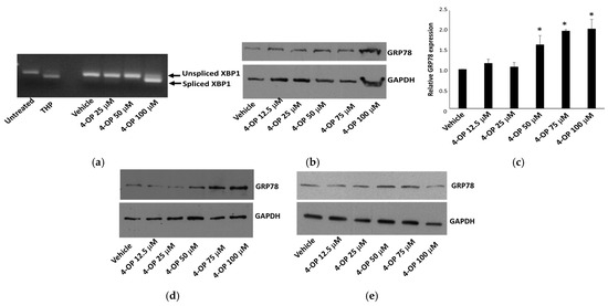 To evaluate whether the exposure to 4-OP could induce the UPR indicating a condition of ER-stress, we analyzed two typical early markers of this process. First, we monitored, via a conventional PCR, the appearance of the X-box binding protein 1 (XBP1) spliced form in HepG2 cells treated for 4 h with different amounts of 4-OP. In our experimental condition, splicing was clear at 100 μM of 4-OP (Figure 4a). The ER-stress inducer thapsigargin (THP) was employed as a positive control in these experiments. We also analyzed the expression of the chaperone glucose-regulated protein (GRP)78, which appeared to increase in a dose-dependent manner reaching higher induction at 100 μM of 4-OP (Figure 4b,c). Similarly, GRP78 expression was markedly induced in MRC5 cells (Figure 4d). Instead, the effect was less evident in Caco-2 cells (Figure 4e). On the whole, data suggested that 4-OP was able to trigger the UPR in human cells, as already described for 4-NP [24].