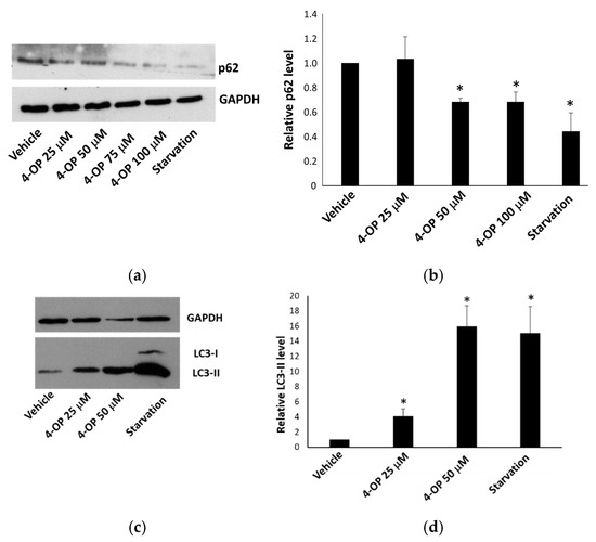 Effect of 4-OP on autophagic markers. (a,b) Western blot and densitometric analysis, respectively, of p62 in HepG2 cells treated for 4 h with 4-OP. (c,d) Western blot and densitometric analysis, respectively, of LC3-II in HepG2 cells treated for 24 h with 4-OP. Starvation represents the positive control. Data are reported as the mean ± SE from three independent experiments. * p < 0.05 versus vehicle-treated cells.