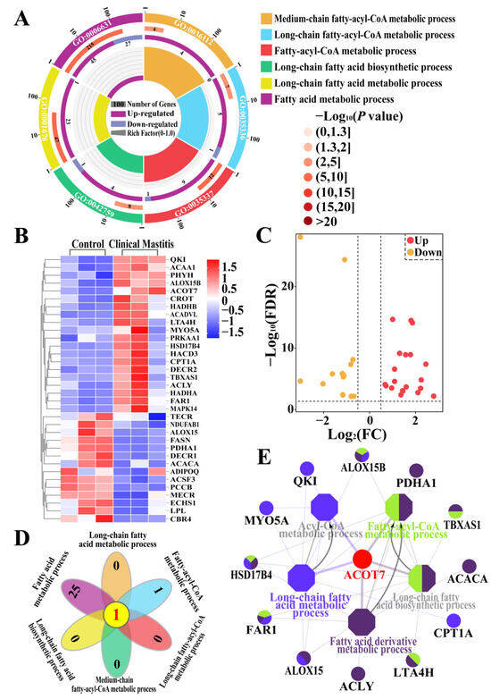 Identification of candidate DEPs and BPs related to FA synthesis or metabolism based on the GO enrichment data. (A) Candidate DEPs and BPs related to FA synthesis or metabolism. (B) Heat map of 34 candidate DEPs. (C) Volcano plot of 34 DEPs, including 14 downregulated and 20 upregulated DEPs. (D) Venn diagram of candidate DEPs in six BPs. (E) Interactive relationship analysis of candidate DEPs and BPs related to FA synthesis or metabolism using ClueGo.