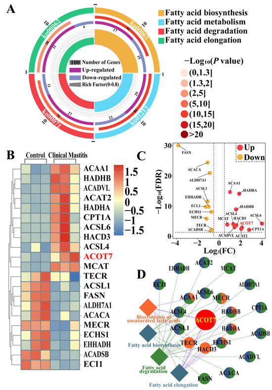 The core DEPs related to FA synthesis or metabolism in dairy cows with CM were identified based on the selected BPs and pathways using the conjoint analysis method (Figure 3). A Venn diagram showed that 12 of the 43 candidate DEPs were co-expressed in six BPs and four pathways involved in FA synthesis or metabolism (Figure 3A). Among the twelve shared DEPs, expression levels of seven were upregulated and five were downregulated; in particular, expression levels of carnitine O-palmitoyltransferase 1 (CPT1A), ACOT7, and FASN exhibited changes that exceeded two fold (Figure 3B). The Sankey diagram showed that ACOT7, as a core DEP, was associated with six BPs and the FA elongation pathway (Figure 3C). The PPI network further indicated that ACOT7 was a core DEP that interacts with other candidate DEPs and is involved in FA and mitochondrial energy metabolism (Figure 3D).