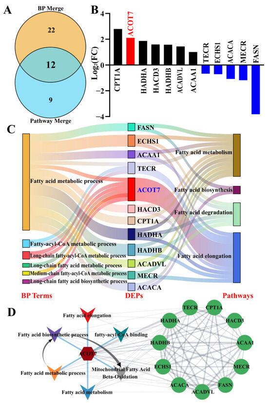 Identification of core DEPs related to FA synthesis or metabolism based on BPs and pathways. (A) Venn diagram of candidate DEPs among the merged BPs and pathways. (B) Relative expression levels of 12 DEPs quantified by DIA proteomics; the y-axis represents the log2 (FC) values. (C) Sankey diagram of the BPs, shared DEPs, and pathways related to FA synthesis or metabolism. (D) Constructed PPI network of the shared DEPs using ClueGO.