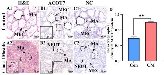 Distribution analysis of ACOT7 in mammary glands of the two groups. (A) Pathological variation in bovine mammary glands of the healthy control group (Con/C; A1) and clinical mastitis groups (CM; A2) based on H&E staining. (B) ACOT7 distribution in bovine mammary glands of the Con/C (B1) and CM (B2) groups based on immunohistochemical staining. (C) Negative control (NC) for Con/C (C1) and CM (C2) groups. (D) Gray values of positive expression of ACOT7 protein quantified using ImageJ 1.44p software. Con/C, control group. CM, clinical mastitis group. NC, negative control; MA: mammary alveoli; MECs, mammary epithelial cells; NEUT, neutrophil. Scale bars, 50 μm (200× magnification). ** represents p < 0.01.