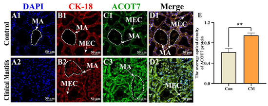 Co-localization analysis of ACOT7 in mammary glands of the two groups. (A–D) Co-localization analysis of ACOT7 in bovine mammary glands of the Con/C and CM groups: nuclei (blue, A1,A2), CK-18 (red, B1,B2), ACOT7 (green, C1,C2), merged with CK18 and ACOT7 (D1,D2) staining, respectively. (E) Positive IF signals of ACOT7 protein quantified using ImageJ software. Con/C, control group. CM, clinical mastitis group. MA, mammary alveoli; MECs, mammary epithelial cells; Scale bars, 50 μm (200× magnification). ** represents p < 0.01.