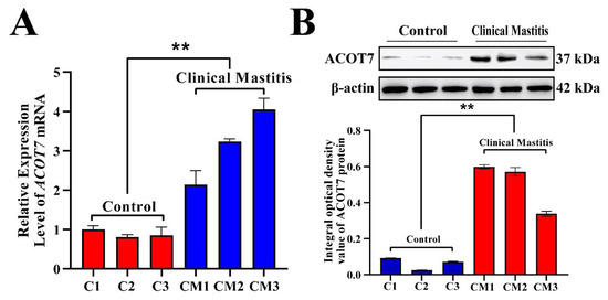 The relative expression levels of ACOT7 mRNA and protein were evaluated in bovine mammary tissues using qRT-PCR and Western blotting (Figure 6). Compared with that in the Con group, the relative expression level of ACOT7 mRNA was significantly upregulated in the mammary gland tissues of the CM group (Figure 6A). Moreover, ACOT7 protein expression was present but different in each sample of the Con and CM groups (Figure 6B). Results of the average IOD of each band showed that the relative expression level of ACOT7 in the CM group was significantly upregulated compared to that in the Con group (p < 0.01). These findings suggest that the upregulation of ACOT7 expression is positively correlated with the occurrence of CM in dairy cows.