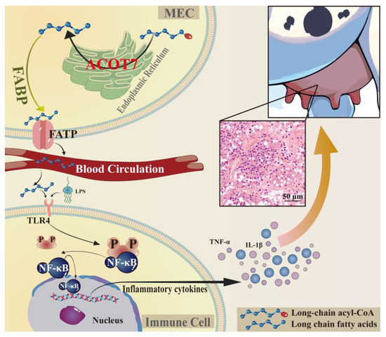 Based on these experimental results and previous research, we propose a potential mechanism underlying the role of ACOT7 in CM (Figure 7). Specifically, ACOT7 hydrolyzes long-chain acyl-CoA to acetyl-CoA in the endoplasmic reticulum, thereby promoting LCFA synthesis [41]. These FAs are transported to the extracellular space and bloodstream by FA transport proteins (FATPs) and FA-binding proteins (FABPs) [42,43]. This process activates the TLR4 pathway, triggers NF-κB signaling cascades, and ultimately promotes the expression and release of inflammatory factors, such as TNF-α and IL-1β, thereby enhancing the inflammatory response. However, this study still has certain limitations, and validated assays based on results at the cellular and animal level need to confirm this. Addressing these aspects would enhance the credibility of the interpretations. Nevertheless, we systematically identified candidate DEPs related to FA synthesis or metabolism that contribute to the onset and progression of CM in dairy cows, providing new insights into the prevention and treatment of mastitis in dairy cows. In addition to the fundamental findings on the role of ACOT7 and fatty acid metabolism in CM, this study holds significant practical implications for dairy farming. Moreover, the findings on ACOT7 provide a theoretical basis for the identification of new drug targets and potential biomarkers for CM.