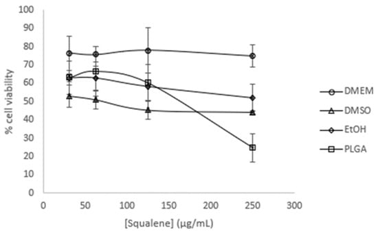 Viability effect on undifferentiated Caco-2 cells incubated with different squalene concentrations using DMEM, DMSO, EtOH, and PLGA vehicles for 72 h.