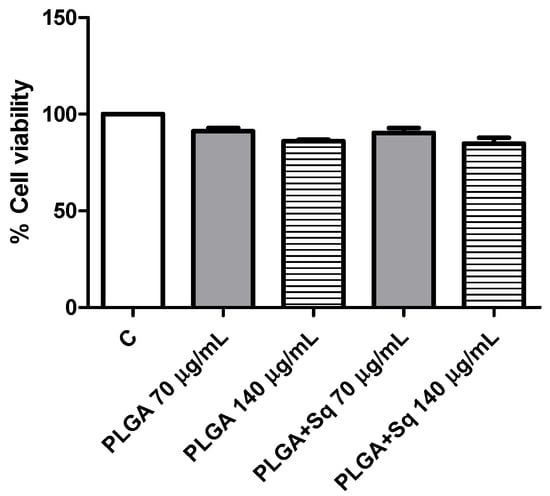 Cell viability measurement after pretreatment of cells with 5 mM NAC for 2 h followed by treatment of cells with 140 μg/mM PLGA + Sq for 72 h. * p < 0.05 vs. control. C, control, refers to untreated cells.