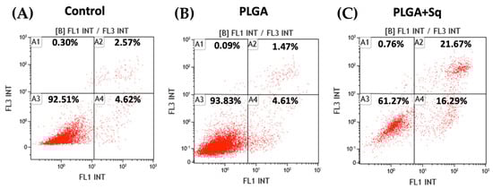 Incubation of undifferentiated Caco-2 cells for 72 h. (A) Negative control, referring to the untreated cells, (B) PLGA, (C) PLGA + Sq at IC50 concentration (140 μg/mL). Percentages of alive (A3), necrotic (A1), early apoptotic (A4) and late apoptotic (A2) cells are indicated.