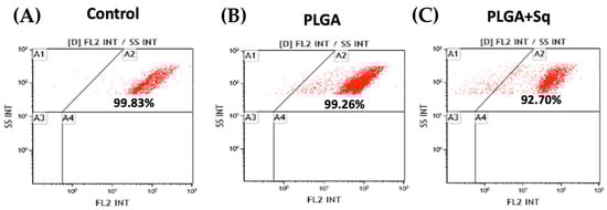 For the apoptosis assays, cells were seeded in 25 cm2 flasks and exposed to PLGA + Sq at the IC50 concentration for 72 h. Cells were then harvested, stained with annexin V-FITC and propidium iodide, and analyzed as previously described []. Negative and positive controls were included, with untreated cells serving as the negative control and PLGA-treated cells as the positive control. Briefly, after incubation, cells were transferred to flow cytometry tubes and washed twice with phosphate buffered saline (PBS), followed by resuspension in 100 µL of annexing V binding buffer (100 mM Hepes/NaOH (pH 7.4), 140 mM NaCl, 2.5 mM CaCl2). A total of 5 µL of annexin V-FITC and 5 µL of propidium iodide were added to each tube. After a 15 min incubation at room temperature in the dark, 400 µL annexin-binding buffer was added and analyzed by flow cytometry (Beckman Coulter, Brea, CA, USA) for 1 h. Signal intensity was measured with a BD FACSAriaTM Cell Sorter (BD Biosciences, San Jose, CA, USA) and analyzed with BD FACSDivaTM version 8.0 Software (BD Biosciences, San Jose, CA, USA).