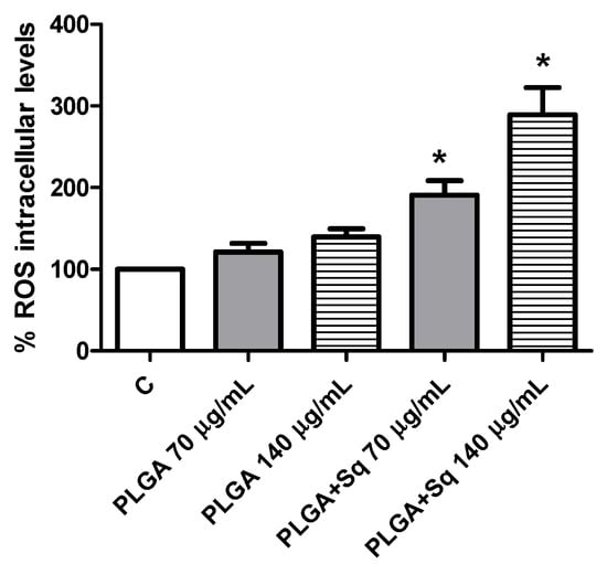 Measurement of ROS levels on undifferentiated Caco-2 cells after 24 h incubation with PLGA + Sq and PLGA alone. PLGA 70 or 140 μg/mL (without Sq) represents the PLGA-NPs required for the indicated Sq concentration. * p < 0.05 vs. negative control (without PLGA and Sq). C, control, refers to untreated cells.