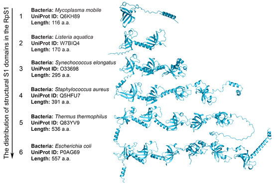 Figure 1. Schematic representation of the distribution of structural S1 domains in the RpS1 family in different bacterial phyla. Three-dimensional structures are predicted by the AlphaFold program (https://alphafold.ebi.ac.uk/, accessed on 1 October 2024).