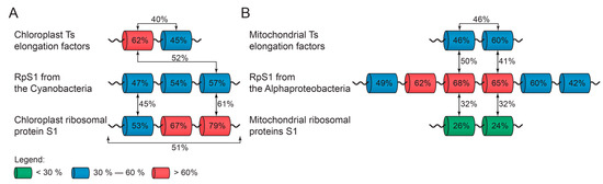 Figure 2. Percentage of identity within each S1 domain and between domains in RpS1 (Cyanobacteria, Alphaproteobacteria) in comparison with groups of chloroplasts (A) and mitochondrial (B) Ts elongation factors. The domains with the highest sequence identity are marked. The identity percentages between such domains are shown. The identity percentage reflects the results of multiple alignments of individual S1 domains.