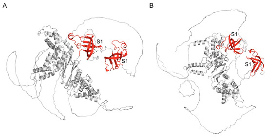 Figure 4. Structural models (obtained by AlphaFold) of chloroplastic elongation factor Ts (A) from A. thaliana (UniProt ID: Q9SZD6) and mtEF-Ts (B) from B. distachyon (UniProt ID: I1HXX8). S1 domains are highlighted in red.