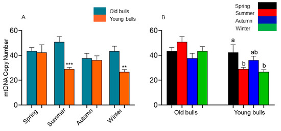 Differential analysis of sperm-borne mitochondrial copy number between the old and young bulls’ spermatozoa (A) and between seasons among each group of bulls (B). Values are presented as geometric mean ± geometric standard deviation. ** Refers to significant differences, p < 0.01; *** refers to significant differences, p < 0.001. Different letters refer to significant differences, p < 0.05.