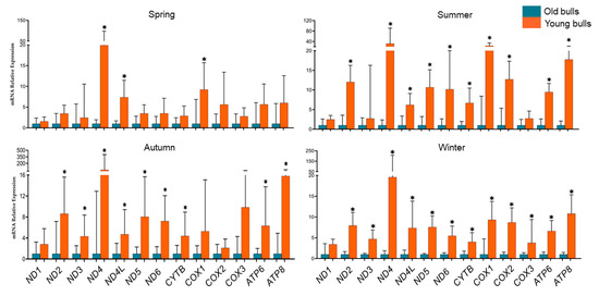 Differential expression analysis of sperm-borne mitochondrial protein-coding genes along the different seasons of the year in the spermatozoa of old and young bulls. Values are presented as geometric mean ± geometric standard deviation. * Refers to significant differences, p < 0.05.