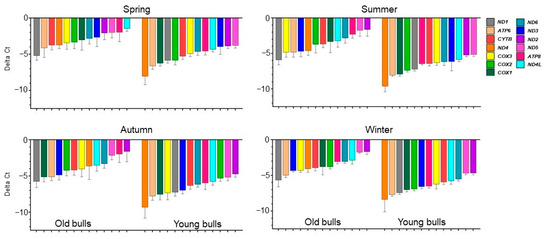 To illustrate the abundance of the genes in each bull group during the same season the analyzed genes were sorted according to their delta Ct (cycle threshold) values. The analysis demonstrated that the abundance of the genes differed between old and young bulls within the same season; moreover, it differed between seasons within the same bull group (Figure 4 and Figure 5). The mRNA of the ND1 gene was the most abundant among the thirteen genes in spermatozoa of old bulls throughout the year. However, ND4 and ATP6 were the most abundant transcripts, while ND2 and ND5 were the lowest abundant ones among the sperm-borne analyzed genes in young bulls throughout the year (Figure 4 and Figure 5).