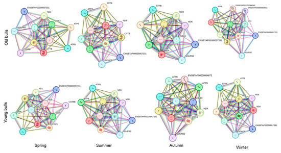 The protein–protein interaction network analyzed by String software version 12.0 for the top six abundant mitochondrial protein-coding genes in each group of bulls throughout the year. An edge was drawn with up to seven differently colored lines that represent the existence of the seven types of evidence used in predicting the associations. The red line represents the fusion evidence; the green line represents the neighborhood evidence; the blue line represents the co-occurrence evidence; the purple line represents the experimental evidence; the yellow line represents the text-mining evidence; the light blue line represents the database evidence; and the black line represents the co-expression evidence.