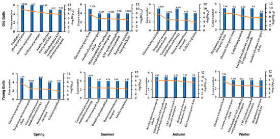 The in silico analysis for the top six abundant expressed genes in each bull group for every season using gene ontology and protein–protein interaction online tools showed eleven protein-to-protein interactions in old and young bulls (Figure 6). The ND1 had the highest number of interactions in old bulls throughout the year. However, in young bulls, the ND4 showed high interactions with the other 10 proteins (Figure 6). Furthermore, the pathway enrichment analysis of these top six abundant genes showed nine signaling pathways including oxidative phosphorylation, aerobic respiration, cellular respiration, aerobic electron transport chain, ATP-synthesis-coupled electron transport, electron transport chain, the generation of precursor metabolites and energy, proton transmembrane transport, and energy derivation by the oxidation of organic compounds that were differentially enriched by their p-value for the top five biological pathways between the seasons and age groups (Figure 7).