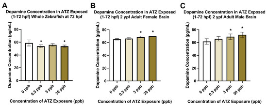 2.2. Embryonic Atrazine Exposure Impacts on Dopamine Concentrations